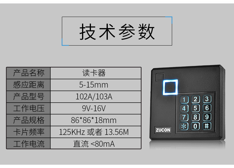 ZUCON祖程102A、103A 刷卡密碼門禁讀卡器通用 IDIC卡按鍵證件刷卡器配控制板