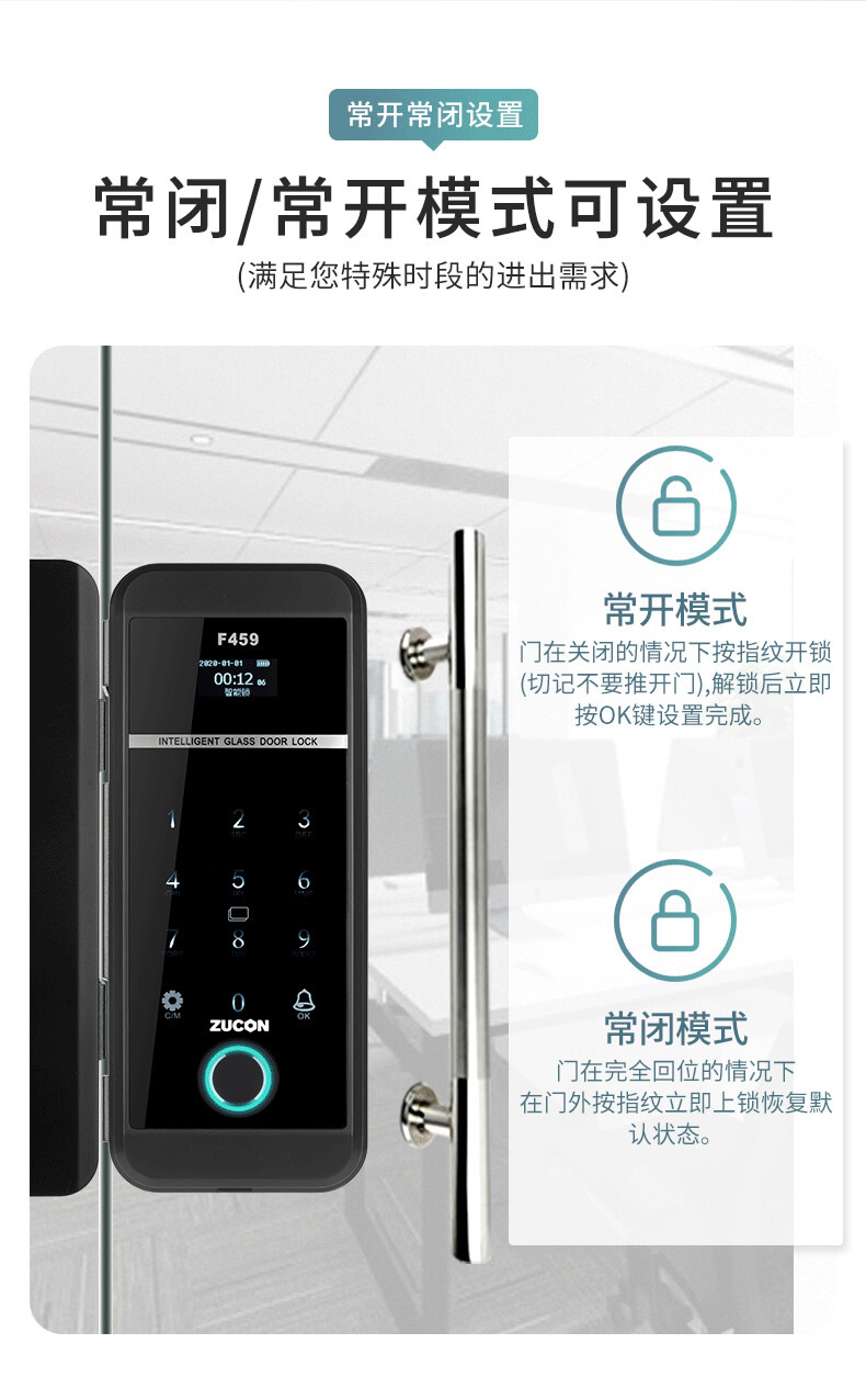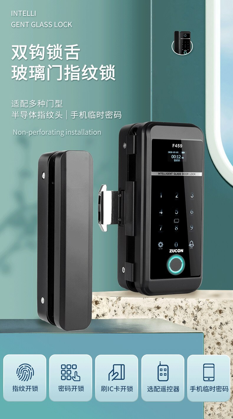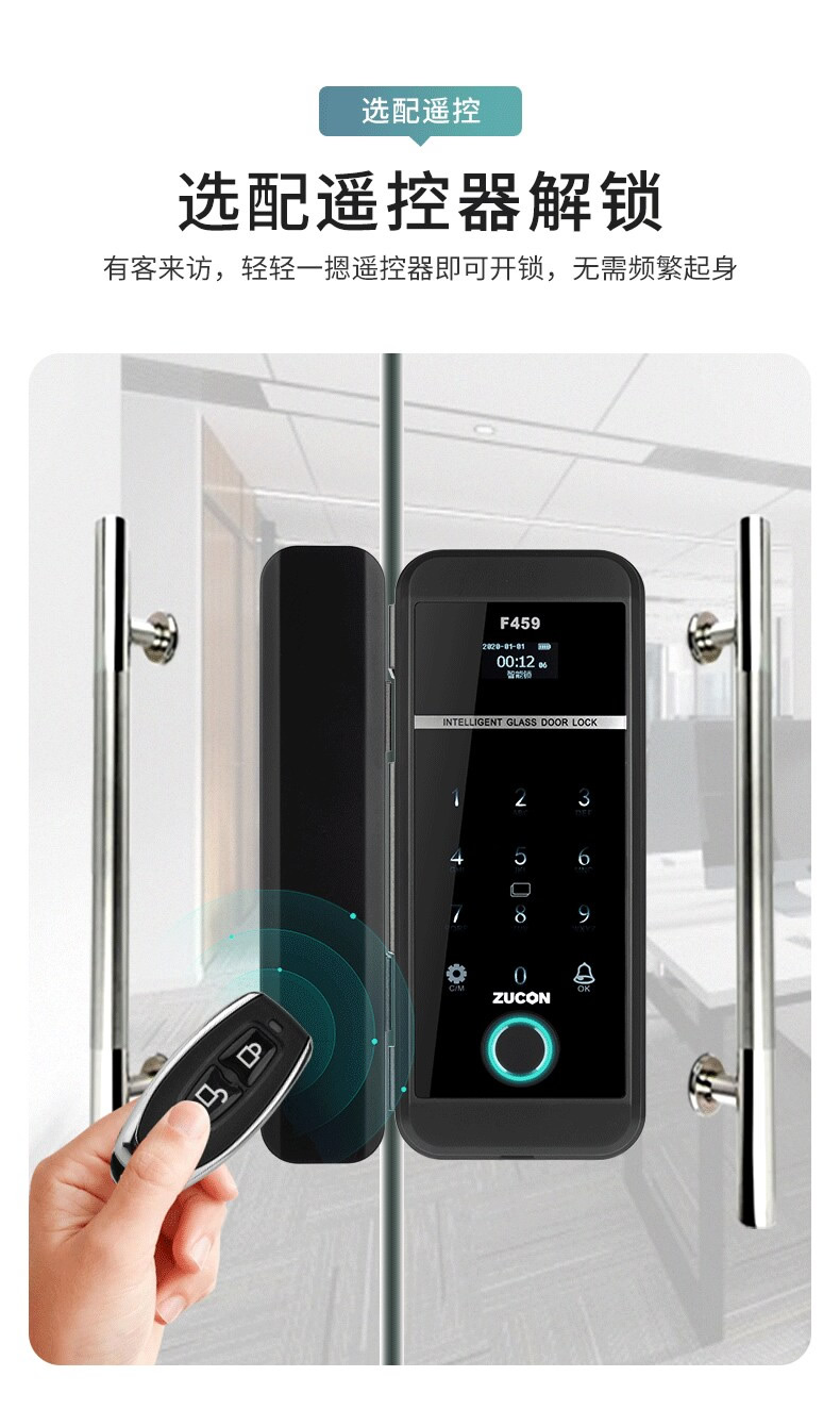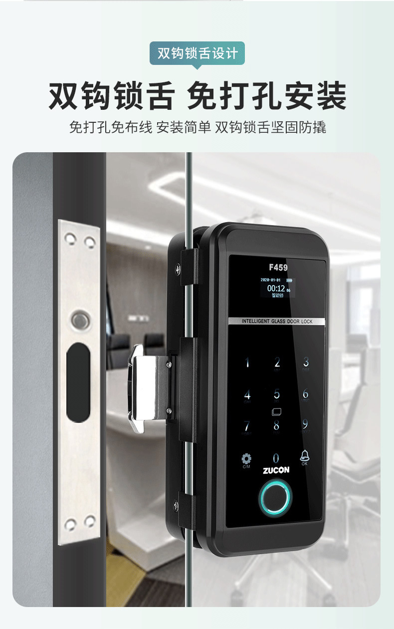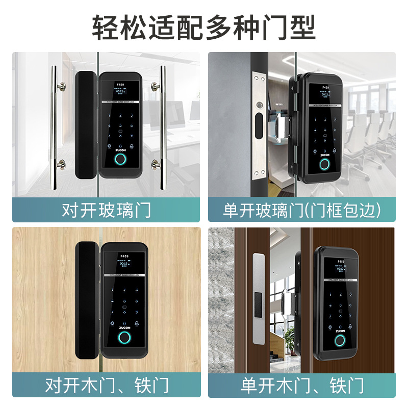 ZUCON祖程F459玻璃門鎖辦公室指紋鎖雙門免開孔智能電子密碼鎖門禁鎖