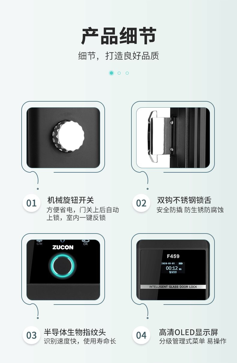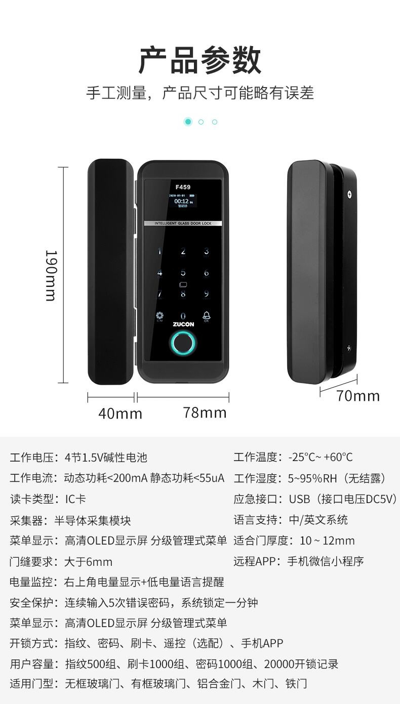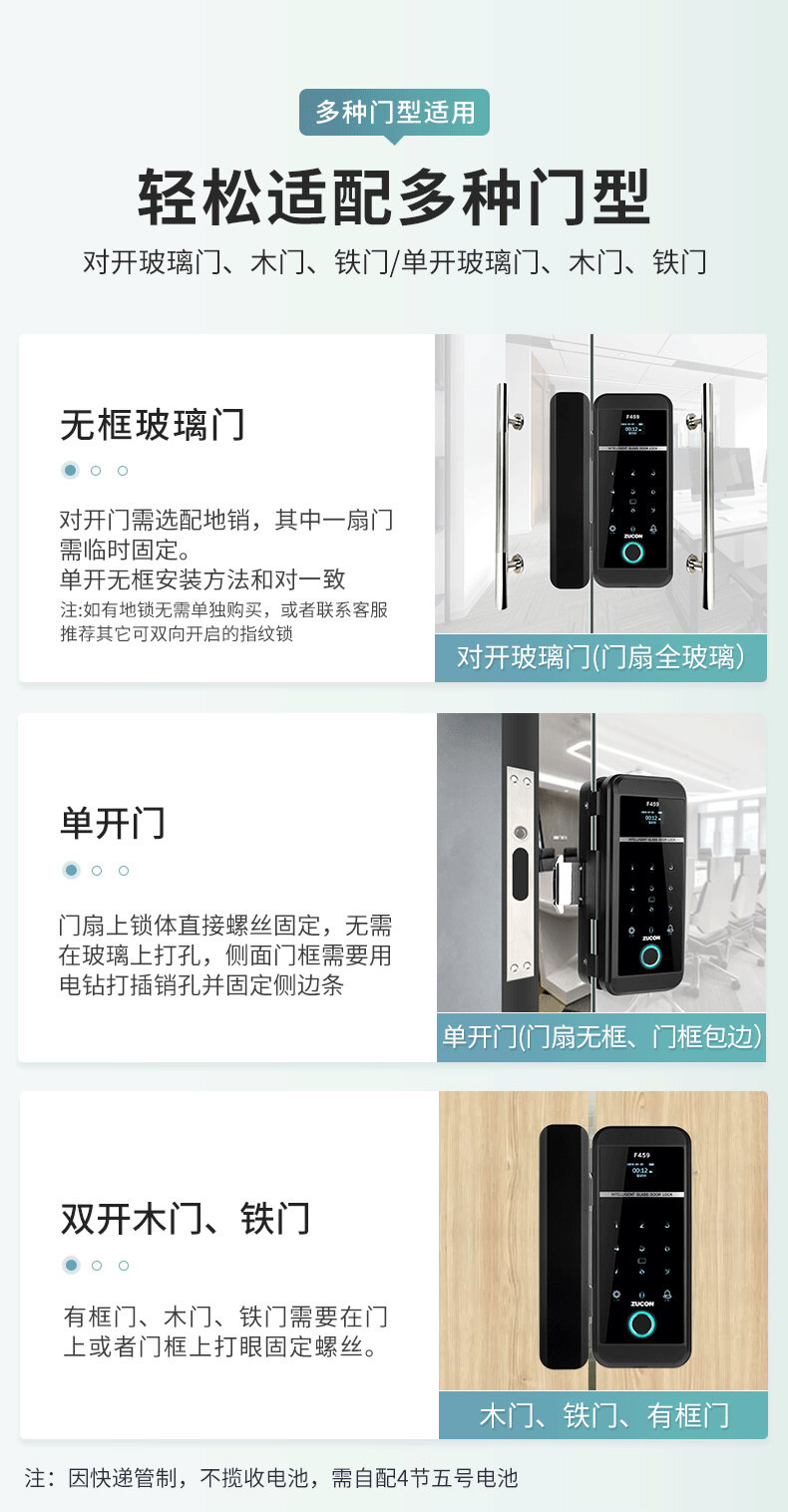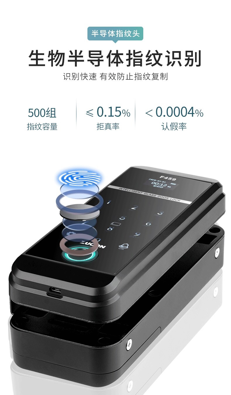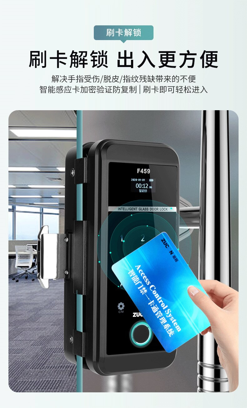 ZUCON祖程F459玻璃門鎖辦公室指紋鎖雙門免開孔智能電子密碼鎖門禁鎖