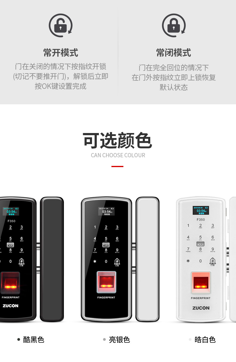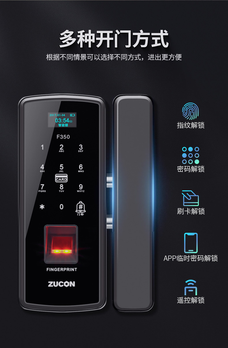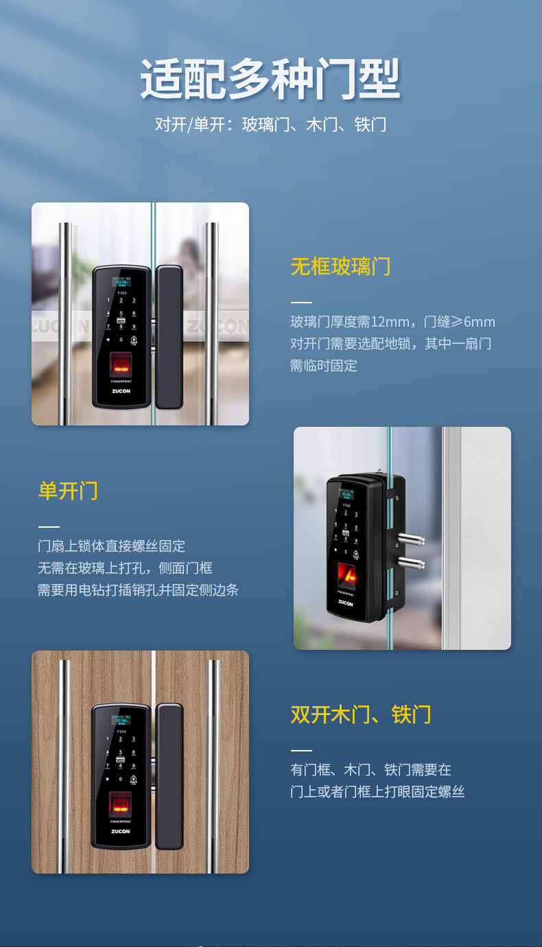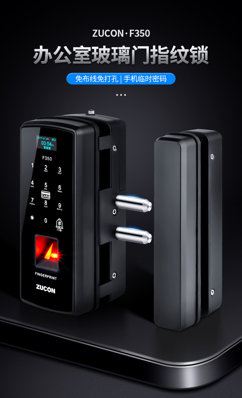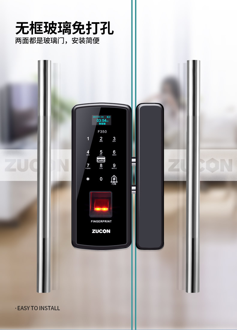ZUCON祖程F350玻璃門指紋鎖免開孔辦公室密碼鎖商鋪門鎖雙門有框智能電子門禁鎖