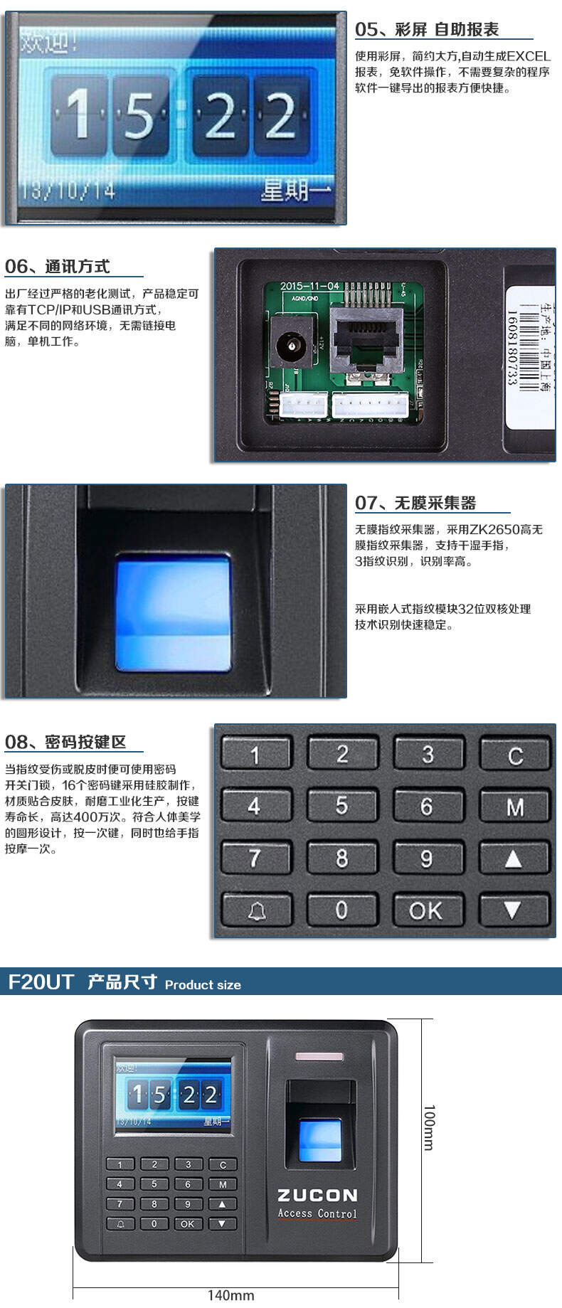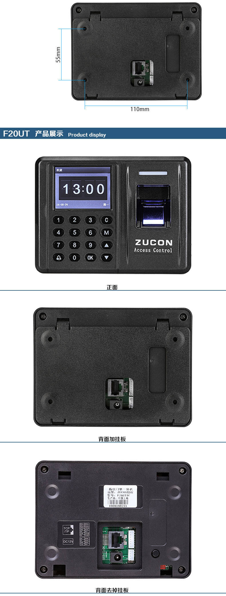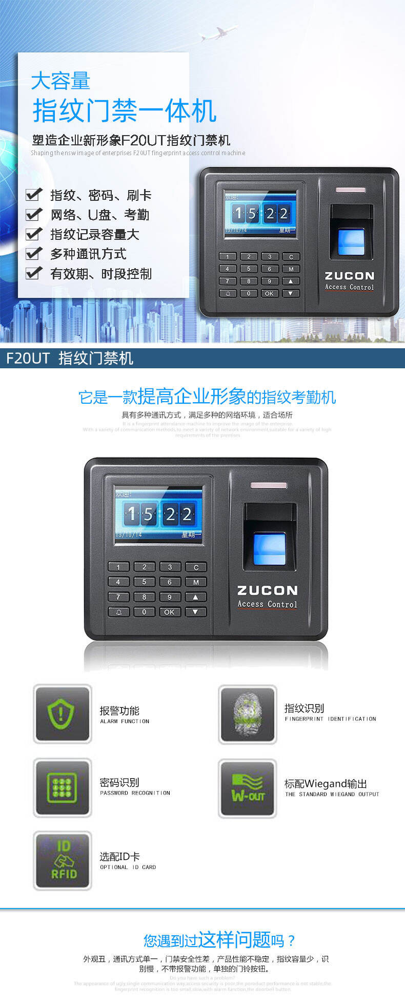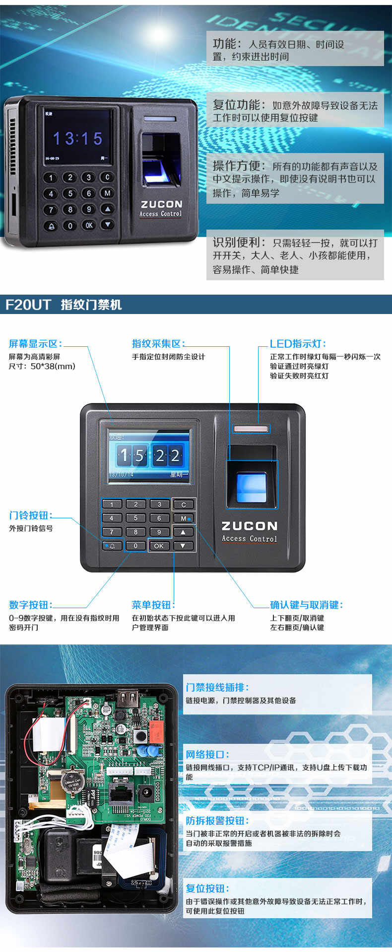 ZUCON祖程F20指紋刷卡密碼門禁考勤主機網絡U盤下載數據3000大容量