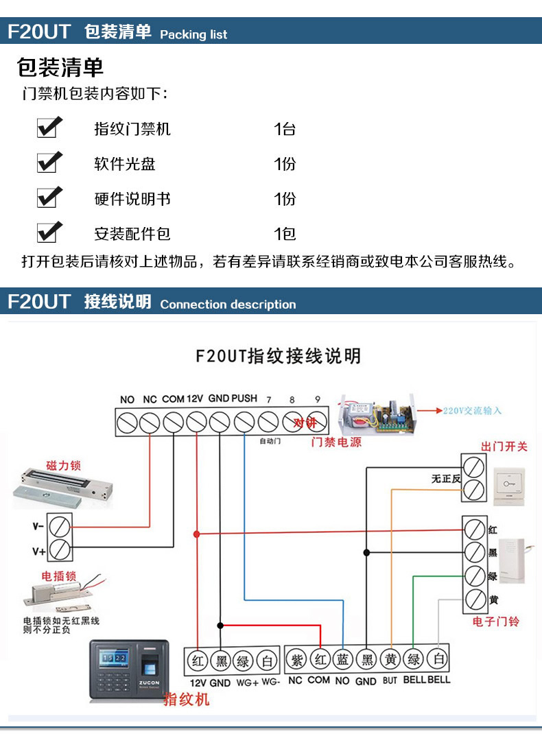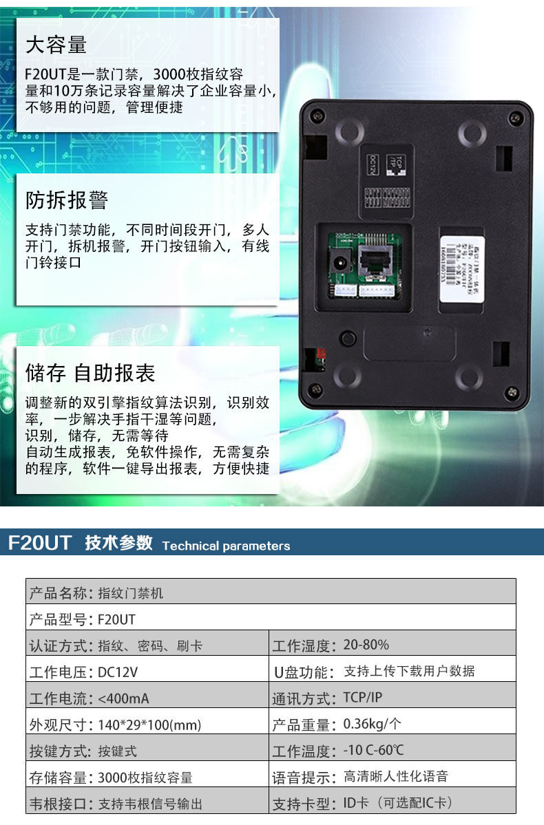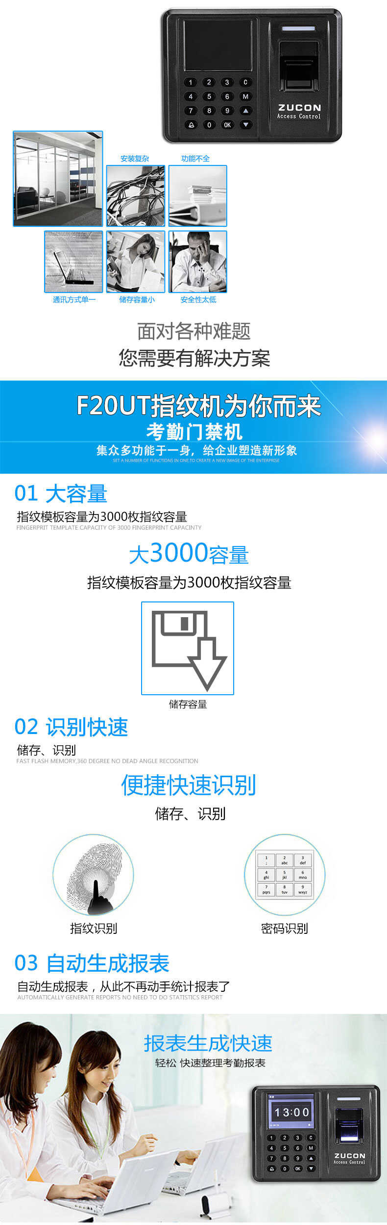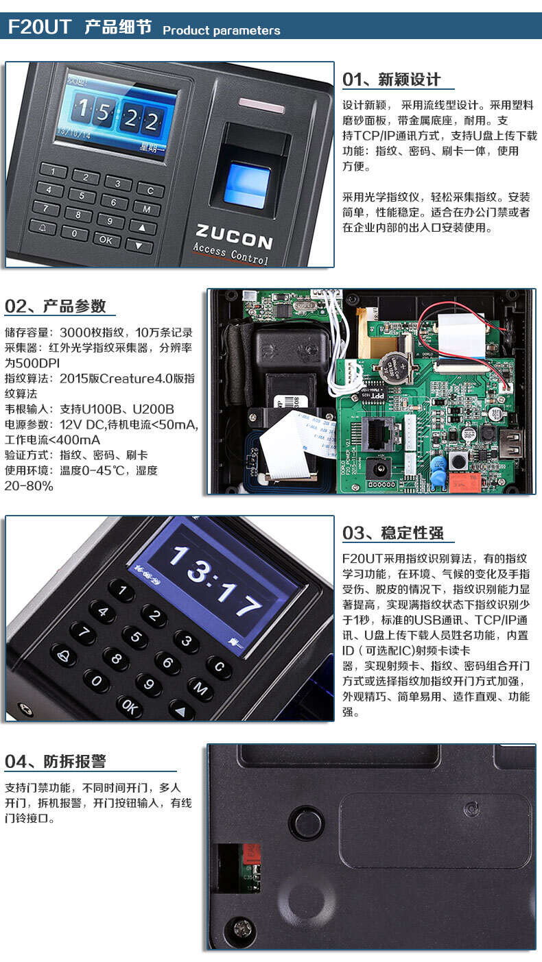 ZUCON祖程F20指紋刷卡密碼門禁考勤主機網絡U盤下載數據3000大容量